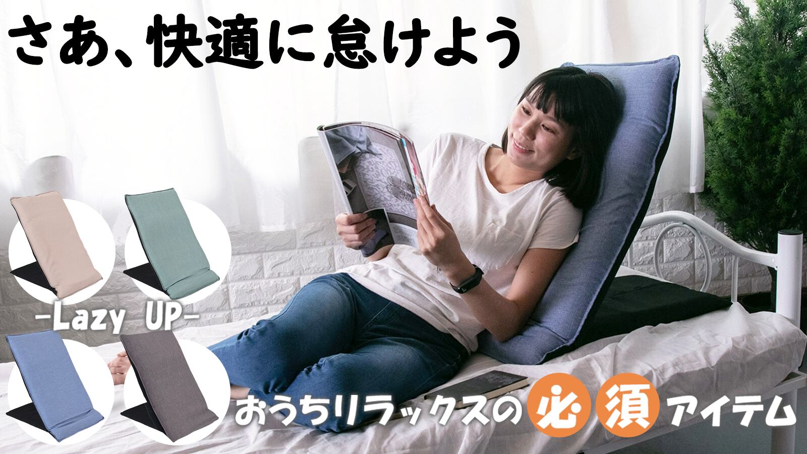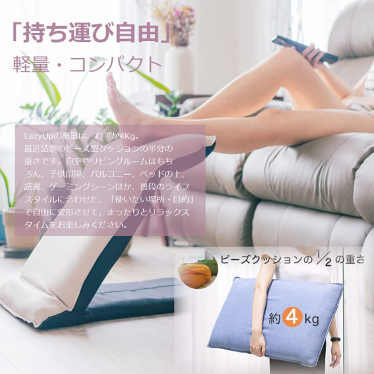 LazyUpは重量わずか4kgと軽量かつコンパクト。自室やリビングルームはもちろん、子供部屋、バルコニー、ソファーやベッドの上など普段のライフスタイルに合わせた、「使いたい場所・目的」で自由に変形させて、まったりとリラックスタイムをお楽しみください。